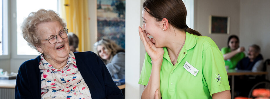 Bei uns zählt, was wirklich wichtig ist: Die kleinen Momente, ein Lachen und die echten Begegnungen - all das macht den Unterschied. Du bringst dein Fachwissen und vor allem deine Persönlichkeit ein. Du bist da, wenn es darauf ankommt und begleitest unsere Bewohnenden mit Herz und Humor. Du bist Teil eines Teams, das zusammenhält und sich gemeinsam um das Wohl der Bewohnenden sorgt.