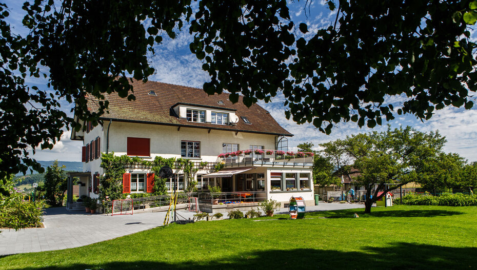 Das Hübeli liegt in ländlicher Umgebung und hat einen schönen, grossen Umschwung mit Fussballplatz, Spielmöglichkeiten, Gemüsegarten und Poolanlage und beherbergt neben den Kindern und Jugendlichen auch Kleintiere.