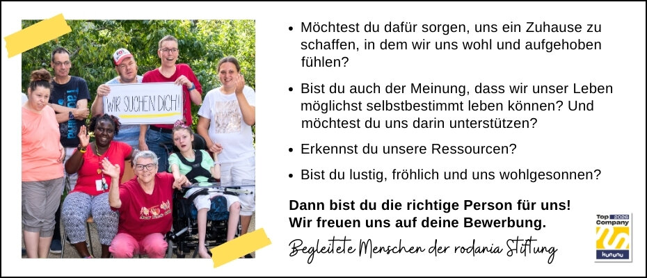 Bei uns in der rodania bekommst du nicht nur eine Top-Ausbildung, sondern leistest auch einen wichtigen Beitrag: Wir sind eine soziale Institution (Wohnheim und Tagesstätte) und begleiten Menschen mit Behinderung im Alltag.