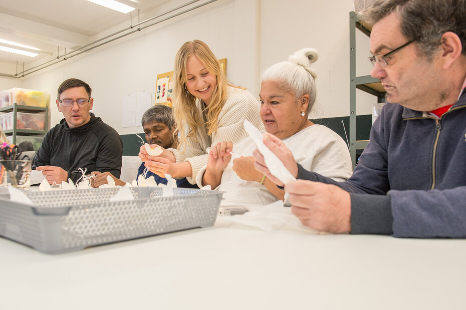 Unsere 45 Mitarbeitenden sind adäquat ausgebildete Fachkräfte, die sich in den Bereichen Wohnen, Tagesstruktur (Arbeit & Freizeitgestaltung) und Administration engagieren.